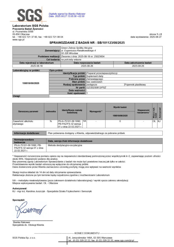 Około 30 kropli (≈ 1,5 ml) dostarcza pełne 1 500 mg standaryzowanego ekstraktu.